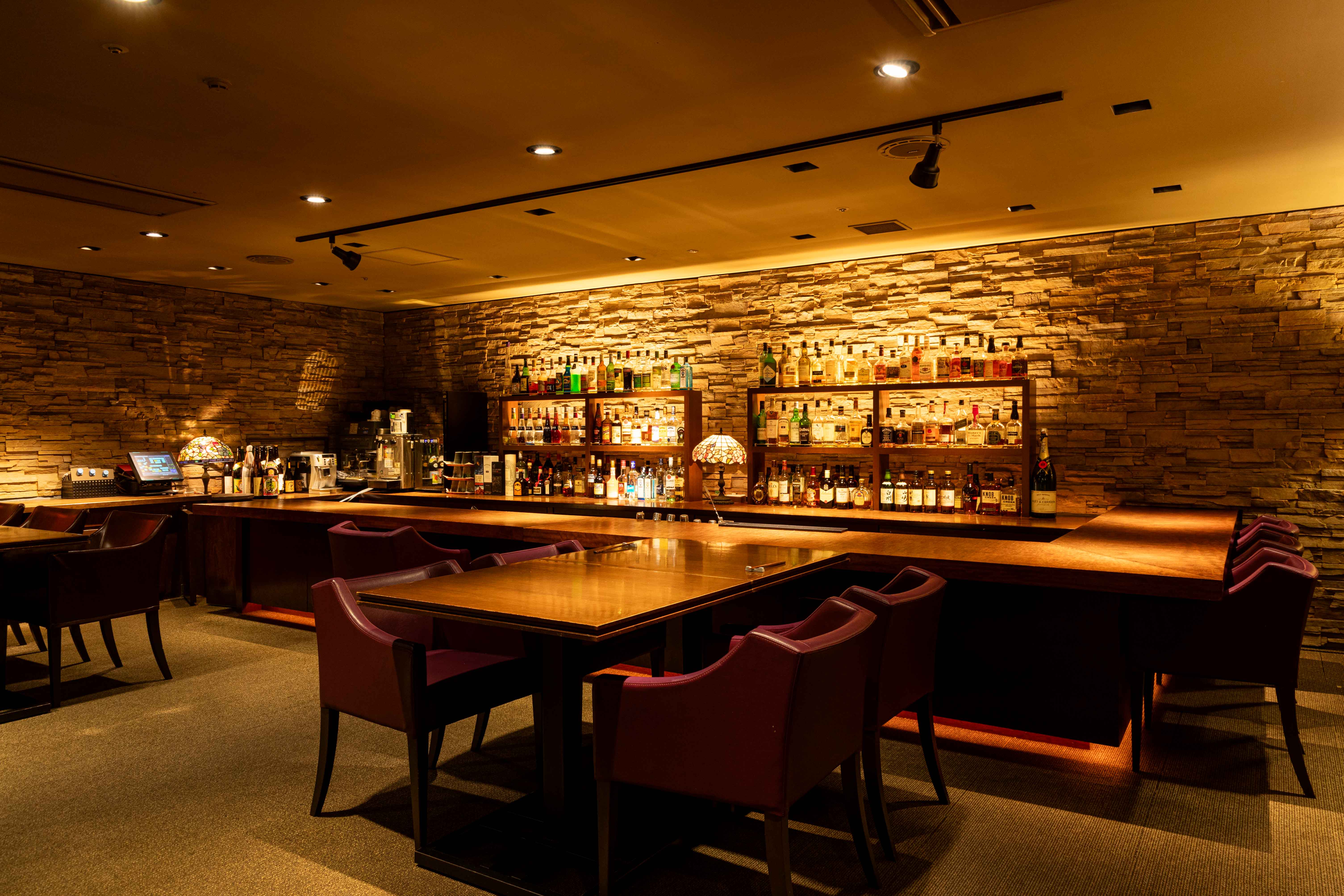 落ち着いた雰囲気のバーゾーンやテーブル席、